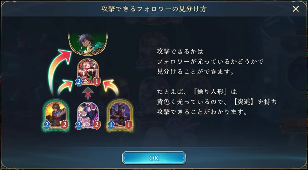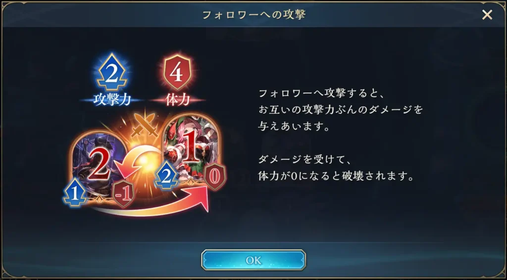 場に並んだフォロワー(攻撃力・体力を持つカード)は、場に出た次のターンから、相手のフォロワーまたはリーダーを攻撃できます。